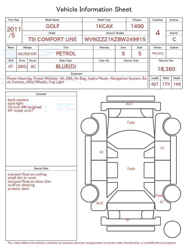 Notas da ficha de inspecção emitida pela casa de leilão