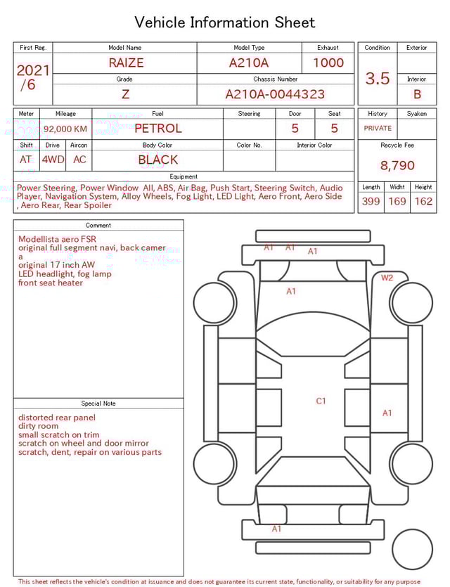 Notas da ficha de inspecção emitida pela casa de leilão