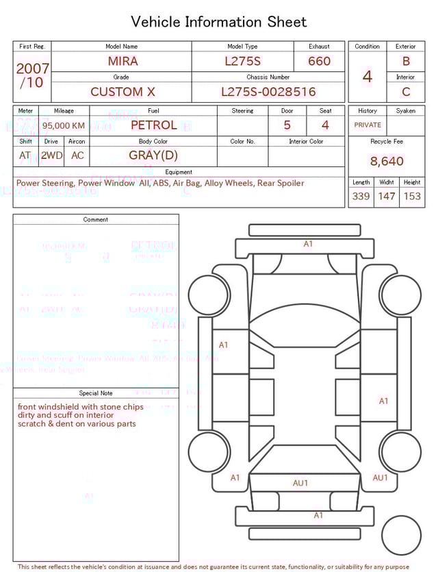 Notas da ficha de inspecção emitida pela casa de leilão