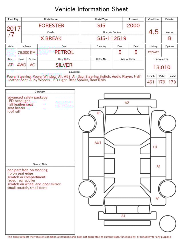 Notas da ficha de inspecção emitida pela casa de leilão