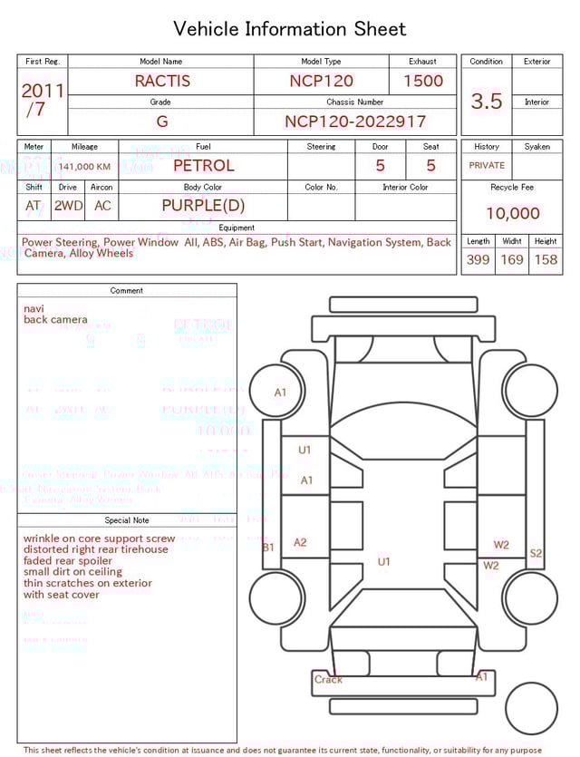 Notas da ficha de inspecção emitida pela casa de leilão