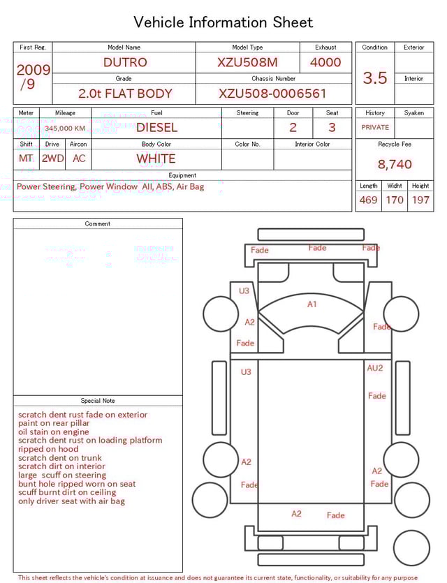 Notas da ficha de inspecção emitida pela casa de leilão