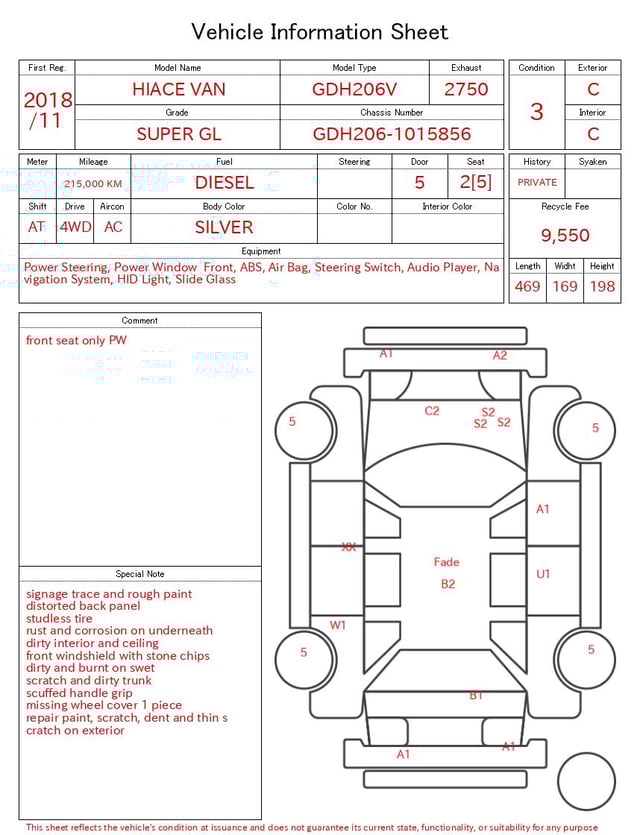 Notas da ficha de inspecção emitida pela casa de leilão
