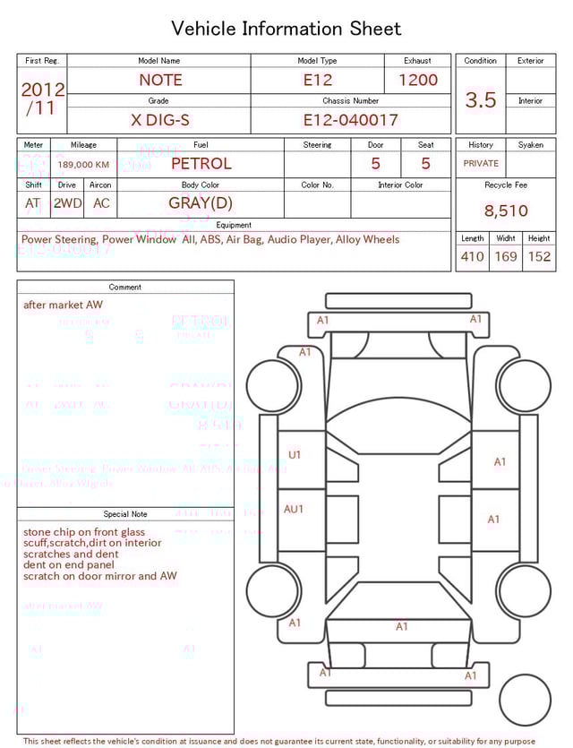 Notas da ficha de inspecção emitida pela casa de leilão