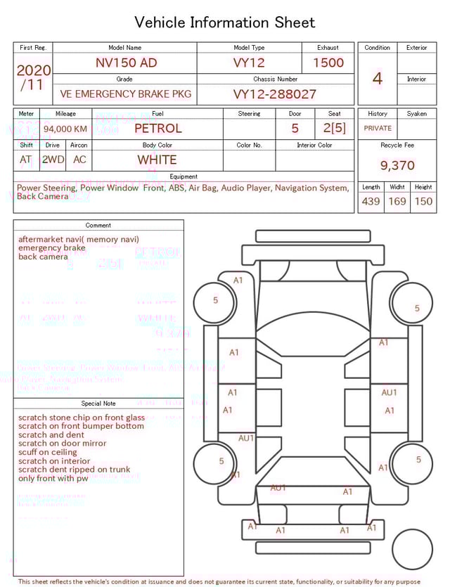 Notas da ficha de inspecção emitida pela casa de leilão
