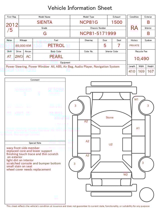 Notas da ficha de inspecção emitida pela casa de leilão