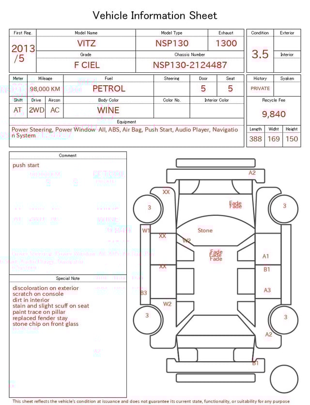 Notas da ficha de inspecção emitida pela casa de leilão