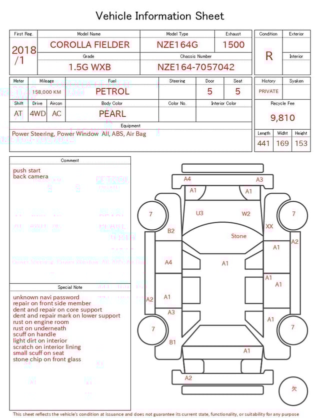 Notas da ficha de inspecção emitida pela casa de leilão
