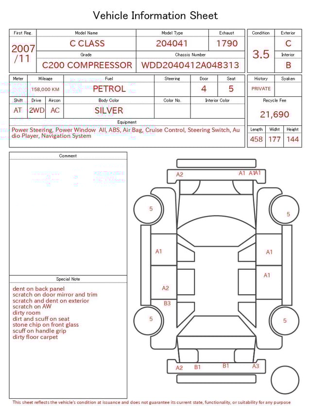 Notas da ficha de inspecção emitida pela casa de leilão