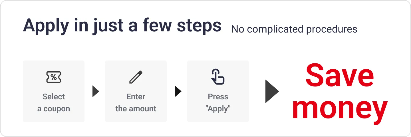 Kutumia kuponi ni rahisi — chagua neno kuponi kutoka kwenye ukurasa wa kuagiza gari au ukurasa usomao Ukurasa Wangu, kisha weka kiasi, na bonyeza kitufe cha "Apply".